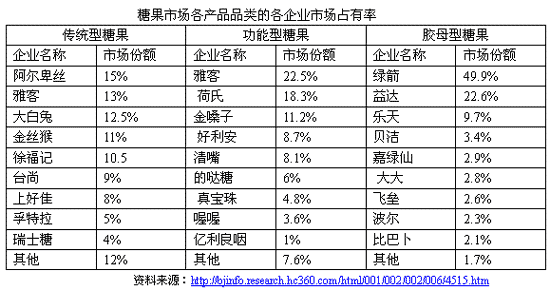 中国糖果市场市场简析 年后不久,随着年市的消失,巧克力的销售也到了淡季。受一家生产企业的委托,我们对巧克力市场作了一个简单分析。 巧克力作为糖果行业里的一个组员,首先应该具有这个行业共有的特性,然后才是自己品类里的特性;为此,我们首先分析了中国的糖果市场的特点。 1、中国糖果市场的发展过程 中国糖果市场经过多年的发展变迁,由当年大白兔一统江山,到现在的品牌林立,其间经历了三个比较显著的阶段:第一阶段从80年代开始到96年初,这个阶段以国产品牌的散装糖为主,是国内糖果企业的鼎盛期。在这个阶段中,只要产品质量好,就可以畅销大江南北,得到消费者的认可和青睐;从营销From EMKT.com.cn的手段来看,主要是靠产品上的单点突破。第二阶段由96年初到02年初,这个阶段的糖果市场严重萎缩,不少厂家在这个阶段中无法维持而倒地,更多的企业在艰难度日的同时也在蓄势盘整,等待行业的另一次高速发展。这一阶段的营销手段已经变得比较复杂,单一的产品领先已经不能充分满足市场的需要,只有在符合了市场的渠道、宣传等条件的整合后才有可能形成新的竞争力。第三阶段由02年初到现在,是行业的另一个繁荣期,在这个阶段里行业的市场容量不断的扩大,外资品牌纷纷进入中国,竞争程度也日益激烈;为了适应这种激烈的竞争,产品形势变得多种多样,营销模式也在不断的发生调整变化,形成从战略到产品、渠道、推广的营销体系再到组织、流程、管理等管理体系的系统化营销。 2、现阶段中国糖果市场的几个特点 中国糖果市场的空间巨大 由《产业经济研究》提供的数据表明:2006年中国糖果行业的销售额近160亿人民币。从2002年开始,中国的糖果行业每年保持8%的平均增长数度,高于全球6%的年平均增长率;并且预计今后5年内将仍然保持着一增长幅度。从产量上看,中国已经成为仅次于美国的全球第二大糖果市场;而从人均的消费量上看,目前中国每人每年仅消费0.7公斤的糖果,仅为欧美、日、韩等发达国家的1/10,不及全球人平均消费量的1/3。拥有13亿人口数量中国,人口数量的庞大和人均消费指数的偏低,加上中国经济的不断发展,已经成为全球最重要的糖果市场之一。 行业集中度高,竞争激烈 根据中国食品工业协会糖果专业委员会的统计,国内糖果年销售额达500万规模以上的企业在1998年有419家,2002年有367家,而2004年只有230家。可见,年销售额达500万规模以上企业数量正在逐步减少,集中化程度在加快。从糖果市场的各产品大类来看,以2004年为例,传统型糖果的各糖果品牌市场份额前八名为:阿尔卑丝、 雅客、 大白兔、 金丝猴、 徐福记、台尚、 上好佳、孚特拉。 其绝对集中度CRn指数CR3=40.5%、,CR8=84%,而赫佛因德指数H.I=11.12%;功能型糖果的各糖果品牌市场份额前八名为:雅客、 荷氏、金嗓子、 好利安、 清嘴、 的哒糖 、 真宝珠、喔喔。其CR3=52%、CR8=91.4%,而H.I=12.39%;胶母型糖果的各糖果品牌市场份额前八名为:绿箭、 益达、乐天、贝洁、嘉绿仙、 大大、飞垒、 波尔。其CR3=82.2%、CR8=96.2%,而H.I=31.67%。综上,到了2004年,无论从哪个类型的糖果市场来看,中国的糖果市场基本上都属于中寡占市场,说明中国糖果市场的集中度已经有了进一步的提高,但是其中的竞争非常激烈。 ![]() 本网刊登的文章均仅代表作者个人观点,并不代表本网立场。文中的论述和观点,敬请读者注意判断。