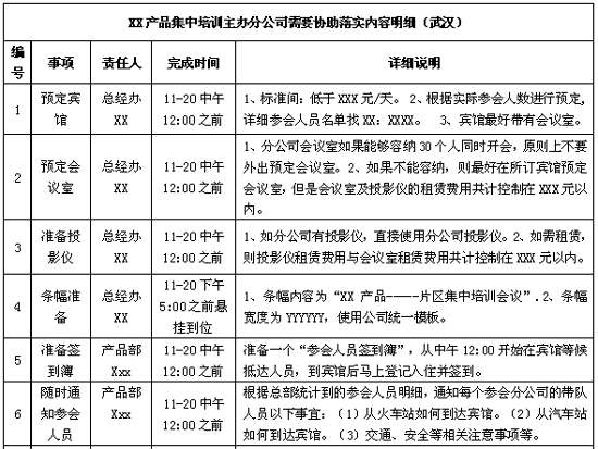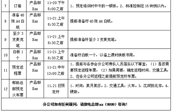 培训组织容易被忽略的五个问题 7 上页:第 1 页 问题四:缺乏细致有效的培训执行流程责任表,导致部分工作遗忘。 大部分培训师在组织一次培训活动的时候,往往以为准备好了课件就万事大吉,而却经常因为一些细节没有注意到而影响到了培训活动的顺利开展。例如,笔者有一次在南京组织华东区域的集中培训,负责会议室安排的同事多次承诺将于培训当天把投影仪安装到位,事实上却没有按照我们的要求提前安装到位。结果当天会议召开的时候,才发现投影仪由于故障无法正常开机,直接导致培训延迟近五个小时。我想很多有过大型培训组织经验的朋友可能都曾经遇到过类似的情况,例如挂条幅的时候才发现没有胶带或图钉,会议召开的时候发现忘了准备白板笔等等,这虽然都是一些小事,但是却都会直接影响到培训的进程和效果。 为了做好整个培训会议的组织工作,做到滴水不漏,在培训会议开始之前要在自己的脑海中把整个事件拍成一部电影。把整个培训过程当中的各个环节分解成一步一步具体的动作。同时形成如下工作安排的对策表。 例如: ![]() ![]() 如果工作复杂,最好使用Microsoft PROJECT制定一个完整的流程任务表,格式如下: ![]() 有了这样一张明确的工作对策表,对任何一个事情的责任人、完成时间等都要求得非常明确,培训师只需要努力讲好自己的课程就好了。 问题五:课程善后事宜往往被省略,导致整个培训虎头蛇尾。 每一次组织的培训,总部和培训师除了希望给一线销售人员带去知识之外,还希望有效的提升驻外人员的工作士气,同时带去总部对于一线人员的关怀。令人遗憾的是,很多总部培训师往往在课程讲完之后就认为一切圆满了。集中培训不仅是给员工提供的一次相互交流、学习的机会,同时也是为我们的优秀员工提供的一种福利。如果能够在培训内容结束之后,争取将外地参训人员送到车站,并且后续再给各位参训人员一个问候短信或者电话,同时返程之后最好以邮件或者电话等向受训人员征求相关的意见和建议,奖励在整个培训过程中表现比较突出的优秀学员,将会使培训效果得到明显的提升。 要做好以上所提到的各项工作,经验和阅历非常重要,因此作为一名优秀的培训师在日常的工作和生活中一定要注意积累、学习。把握好以上的几个细节之后,再加上精彩充实的现场讲解,相信一定能够取得良好的培训结果。 作者现就职于国内某知名家电企业,长期从事企业内训工作。欢迎就相关营销、培训问题进行沟通交流(邮箱: wawaniao@16.com ,博客地址: http://blog.sin.com.cn/m/wawaniao ,QQ:27881472,MSN:wawaniao@hotmai.com 第 1 2 页 本网刊登的文章均仅代表作者个人观点,并不代表本网立场。文中的论述和观点,敬请读者注意判断。