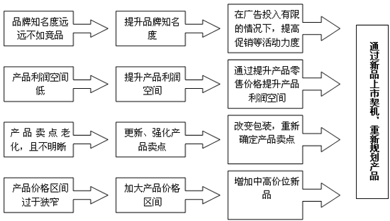新品突围之卖场产品的渠道作价与场内推广 7 上页:第 1 页 柳暗花明又一村 推出新品的想法不是头脑发热,通过前期的调研和与卖场管理部同事们的共同探讨,要从根本上解决问题,必须另辟蹊径,而新产品则是达成这个目标的最佳工具。 张成和卖场管理部同事们的思路可以用下图表示,从图中可以发现,所有的逻辑导向都指向新品上市。而且,新品上市是最为安全也是最为有效的改变明露漆在卖场的现状的办法。