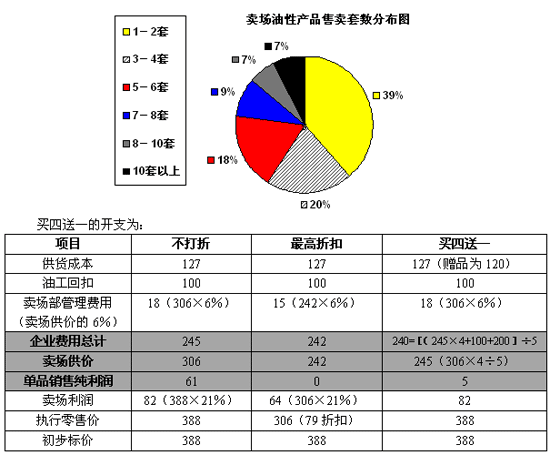 ![]() 为此,张成向明露公司总部提交了卖场产品的新品上市申请。 申请很快得到了批复,但由于曾经推出新品屡屡受挫,因此总部要求张成提出对于卖场新品推广的初步设想。于是,壮丁执笔,张成便根据对市场及竞品的了解对新品进行了一系列的规划。 张成始终怀着一个理念,卖场新品的利润空间是真正的突破口。只有真正把利润空间做足,卖场管理部才有希望做强力度的促销活动,才有希望提高对卖场的支持力度,才有希望加大对油工的刺激程度。 因此,张成毫不犹豫的将目光投向了中高端产品的价格区间,希望能够以较高的价格,提升产品利润空间,进而提升产品操作空间。 通过调研发现:目前清风在卖场的拳头产品为330元左右的产品,而长青在卖场的拳头产品为400元左右的产品;根据这两个优势竞争品牌的状况,张成初步将该款卖场的零售价格设置在388元。 ![]() 由于卖场利润是零售价倒扣计算的,张成将卖场利润的倒扣点数设置为与竞品相同均在21个点左右,这样就为卖场预留了82元(388×21%)的利润,能够满足卖场的利润需求,并刺激卖场对于明露产品的支持力度。 另外,在卖场管理部的日常工作与卖场维护中,根据经验大概需要预留卖场供价的6个点的管理费用。 在提高产品零售价格的同时,张成将给予油工的回扣定位于100元,足以对油工产生强大的吸引力。在此基础上,结合目前建材市场的行规现状,张成得到了该款产品的渠道作价图: ![]() 对该款卖场新品的价差体系规划之后,张成即开始提炼该款卖场产品的卖点,并设定品名为润玉产品。同时,为了强化卖点,提高卖场包装的层次,张成为其设计了专门的包装,并特别在包装上注明:“全无苯,超级环保”,以吸引消费者更多的目光。 通过以上努力,张成基本完成了对润玉产品的价格体系、价差体系的设计与产品包装、卖点的完善工作。在此基础上,增加了明露的中高价位产品,明露产品的利润空间低、产品卖点不完善且不清晰的缺点已经得到改善。剩下的,就是如何利用促销完成品牌影响力提升与终端动销的问题了。 促销设计:成本核算见真章 促销包含了对渠道的促销和对最终用户的拉动两个方面,对于渠道(包括卖场和油工)的促销已经在产品价差规划中作了预算,剩下的就是对最终消费者的拉动了。 由于新品在整个明露产品体系中属于第一次露面,没有任何可对应的促销政策可以参考。更要命的是,促销需要大量的费用,总部明令新产品的促销活动将直接从该款产品的利润中扣除,不享受公司的促销费用的支持。因此,对促销成本的核算成为促销设计的主要内容。 首先,张成们主要考量了润玉产品的最高折扣。具体算法为: 假定润玉产品的企业纯利润为0,卖场售价为x,则存在等式: 127+100+x×21%+x×(1-21%)×6%=x; 则可以得到:x=306;最高折扣为:x/388=306/388=79折扣;但是现在卖场到处都是6折、7折的促销,明露公司在没有利润的情况下,推出的这个促销力度对于消费者吸引力并不大。 鉴于这种考虑,张成决定尝试买赠方式,直接赠送产品,不仅刺激了消费者,也带动了润玉产品的销量。 在对消费者进行研究的过程中,张成发现,卖场中购买油漆以购买5~6组的人数较多。也就是说,一户人家消耗油漆的量通常在5~6组左右。为了刺激这部分消费者的购买欲望,买四送一将是一种比较好的促销方式。因此,张成核算了买四送一的成本。 核算买四送一时,由于第五组属于赠品,因此卖场并不收取利润;同时,对于赠品由于企业减少了增值税等税收支出,相应的供货成本也下降至120元左右。 ![]() 第 1 2 页 关于作者: