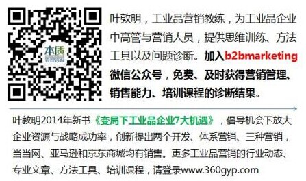 7 上页:第 1 页 ◆工业品企业的五个转型动作,围着客户做市场大文章 以市场为中心配置资源,客户的话语权日益强大,快消品企业身上发生的变化,也会在工业品企业这边体现。品牌、终端、差异化营销From EMKT.com.cn、区域市场精耕细作、营销统领管理体系,这五个转型动作,工业品企业若能跟得上节拍,还有与内外强手周旋的余地。品牌,工业品企业的死穴,一贯只和为数不多的企业客户保持联系,行业中籍籍无名,大众市场上更无半点名声,这样的无名企业,如黑暗骑士般,在阳光明媚的征途上,没有半点路人的注目。产品、企业、企业家、行业与社会的五个品牌阶梯,国内的工业品企业,再难也得往上攀登,招牌不亮,企业的影响力就要减半。 终端再造,也是工业品企业面临充分市场化的必然之举。渠道的内部人控制,生产利润比不上经销商的零头,工厂之所以被渠道牵制,就会因为与客户的长期隔绝。经销商这个客户代言人,若以自我利益为中心,就会拿客户订单当令箭,指使厂家屈从于自己的指挥。厂商利益分配,不是两方能自行解决的,忽视了客户的厂商联盟,就会失去了价值的根基。模仿汽车4S店的工业品新兴终端,其用意要把信息、销售与服务融通一体,客户的零距离体验,方能感受完全产品内在的价值,客户的零耽搁服务,则更能体会到供应商企业的诚信,而企业掌握了客户的一手信息,跟踪需求的及时变化,就能找到企业资源配置的金按钮,服务于客户的资源,才是能创新产品、创造价值的活资源。 差异化营销,服装、化妆品等行业用的纯熟自如,可没有多少工业品企业善于此道。搞怪,人人都会,搞的客户喜欢就难了。守正出奇,差异化营销的灵魂。正,客户价值的正向增加,奇,客户惊喜的产品或服务,对手没想到的招数。内功深厚的工业品企业,往往不善于格斗,出招慢,看不懂对手的变化路数,被动挨打的场景,让人不忍观战。跟风,依然是国内工业品企业的营销拿手戏,一个产品活了,千万人顿时围堵,得了营销近视症,又怎能看清明日的需求契机呢?数据分析与需求洞察,差异化营销的一双火眼金睛,炼就了的工业品企业,方能找到自己的营销特色路,赢得属于自己的客户群。 说到工业品企业的区域营销,跑马圈地者多,精耕细作之人少之又少。机会多的时候,谁也没心思忙于内部精细化管理,只有外在机会少、竞争激烈的困境下,才不得不做实自己。经销商公司化管理、终端生动化、服务本地化体系,能让一个工业品企业从粗放管理到精耕细作,低价格水平下刨到不俗的利润,存量客户中开出增量的花朵,可谓是根深叶茂的持久性经营之道。工业品企业决策者,多花一些心思在市场上,耐心观察对手的动作与本意,体会客户真实应用场景中的需求特征,也多瞧瞧自家经销商与业务人员的身手,刻板的市场在头脑中鲜活起来,营销决策也就生龙活虎,极富战斗力。 营销技巧、方法和工具,工业品企业最为热衷,每次培训课或咨询服务中,客户都会提出明确的想法,要学会简单实用的操作手法,而对营销思维与本质,却甚少关心,总以为,能用的就是好东西,懂不懂的没关系。营销,主导当作促进销售的一种外在刺激办法,根本没有渗透到决策体系中,更没有成为管理的重心与导向。营销,也许只是快消品企业的外家功夫,只要有好的业绩,一切方法和手段都可以选择。而工业品企业的营销,体系性强,从战略、资源到执行,一个个环节紧紧相扣,容不得各形各事的散漫与懈怠。只有当营销统领公司系统,才会想客户所想,成就客户所愿,公司的根扎进了客户需求与价值实现的沃土,茁壮成长的期待定不辜负你的。 ![]() 叶敦明,工业品营销教练,企业战略管理顾问,专著《变局下工业品企业7大机遇》作者,工业品营销传播网创建者(www.360gy.com)。1994-2000年,在ABB和韩国现代电子任职7年的中高管;2000年以来,在为国内大中型工业品企业提供管理咨询与营销咨询服务的同时,还参与了一家新能源与一家工业机器人公司的创业,理论与实践结合,互联网思维与实业经营态度混搭,期望为国内的工业品行业的转型升级,带来自己的独特思考、方法工具与经营指导。更多互动与探讨,请加入工业品营销教练微信公号:b2bmarketing。 第 1 2 页 本网刊登的文章均仅代表作者个人观点,并不代表本网立场。文中的论述和观点,敬请读者注意判断。