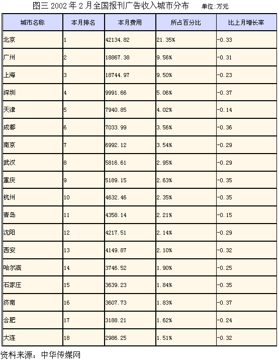 报刊广告量在城市的分布上表现出高度的集中。北京、上海、广州一直是广告经营额最多的城市,被称为广告业的中心城市。从平面媒体广告投放总量上看,上海市总是仅次于北京市,与广州市在伯仲之间。2002年第一季度来看,上海广告投放在全国总量中占10%左右的分额。2002年6月上海市月投放广告的平面媒体共计88种,远少于北京,但较广州多出一倍,其中包括在全国甚至世界都享有权威和声誉的著名报刊。