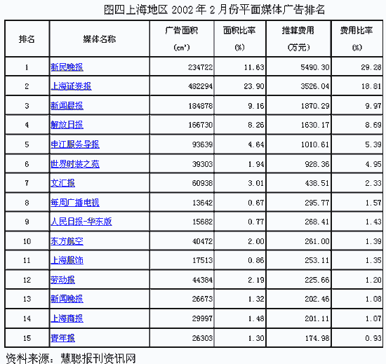 尽管晚报在一些发达国家或地区已经开始走下坡路。但在国内,从广告收入角度来说,晚报及综合型的报纸仍是当之无愧的广告“大户”,在上海地区来看,《新民晚报》以绝对的优势占有上海的平面媒体广告市场。其次,由于上海作为全国的经济中心,有着经济政策背景的报纸,如《上海证券报》,在广告投放排名版上持续地牢占第二位。最后,上海作为一个娱乐业发达的城市,传达娱乐资讯的平面媒体深受广告主的欢迎。